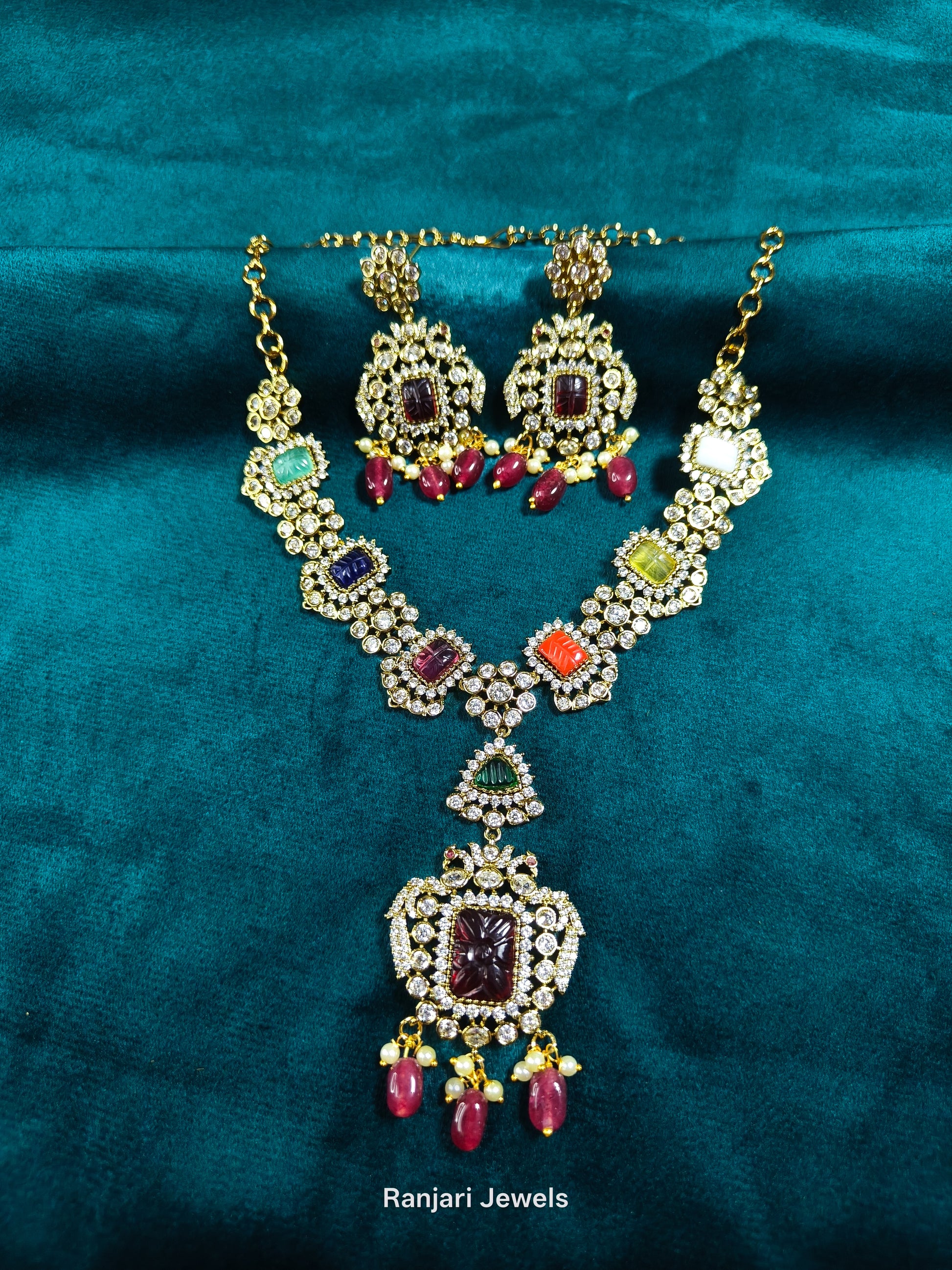 Premium antique gold finish AD necklace set crafted with high-quality American diamonds. Features multi-colour carved stones, a royal centre pendant with pearl & green bead detailing, and matching earrings—ideal for weddings and festive wear.