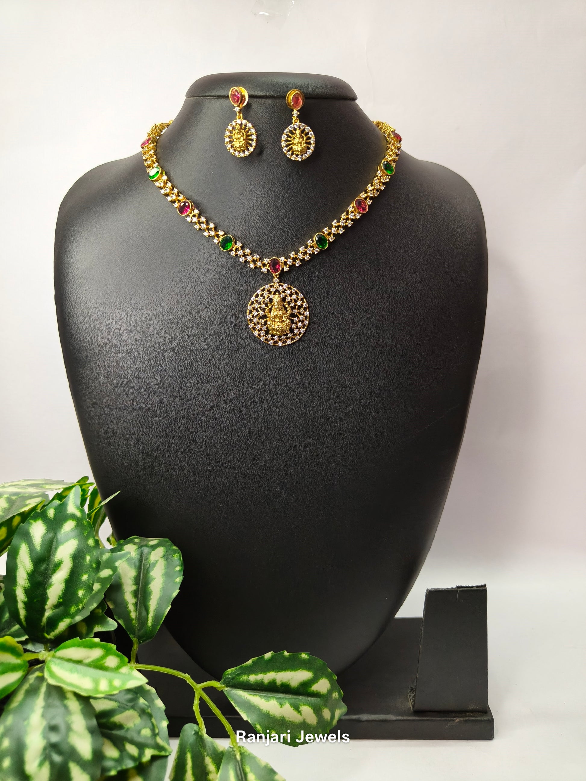 A classic Lakshmi motif necklace set featuring a round pendant with intricate AD detailing and vibrant ruby–green kemp stones. The matching earrings complete the look, making it a timeless choice for festive and temple wear.