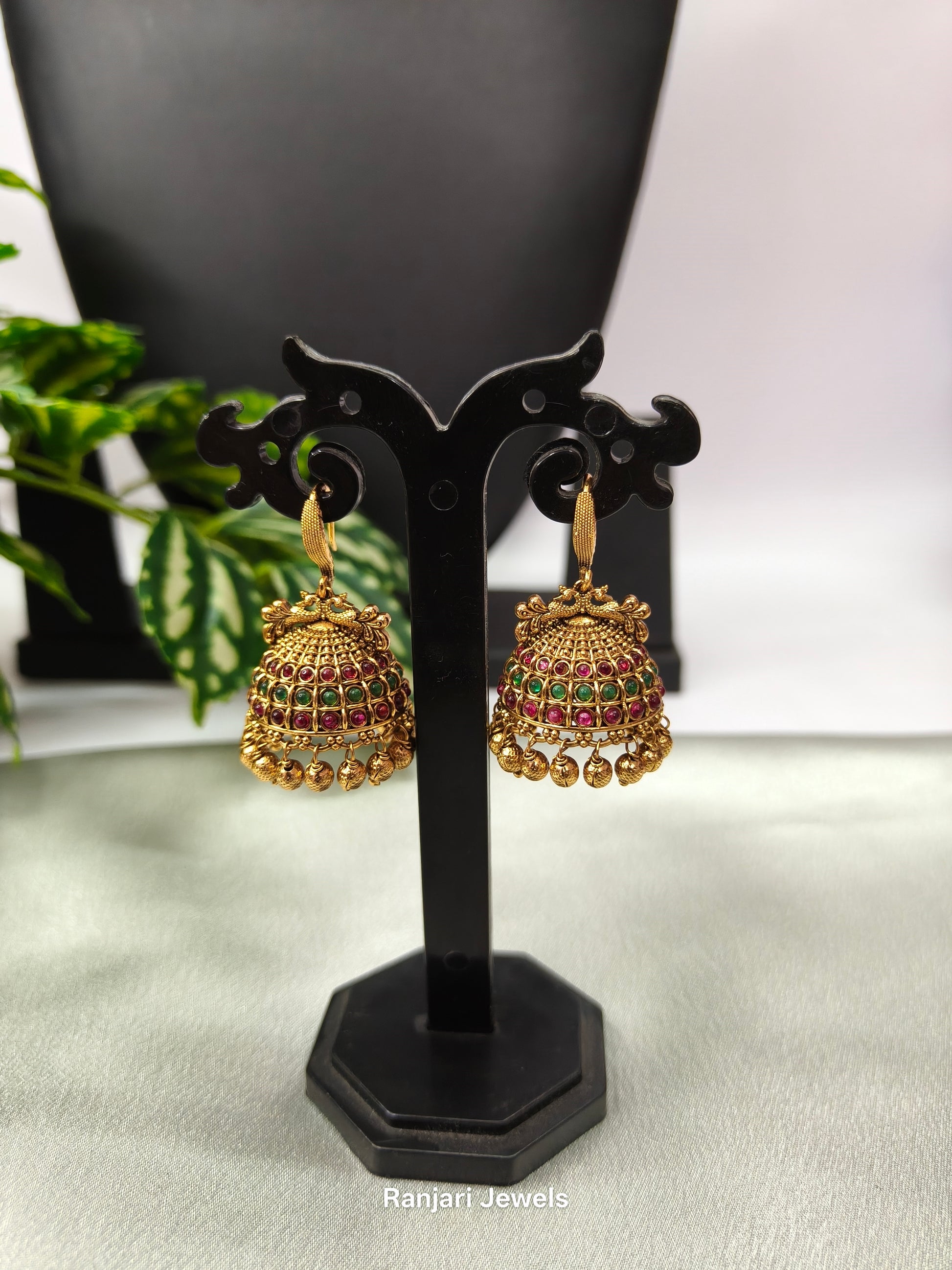 The Ananya Jhumkas feature a timeless dome design studded with vibrant ruby red and emerald green stones, finished in antique gold plating. Delicate Golden ball hangings add a touch of traditional charm, making them perfect for weddings, festive wear, and cultural celebrations.
