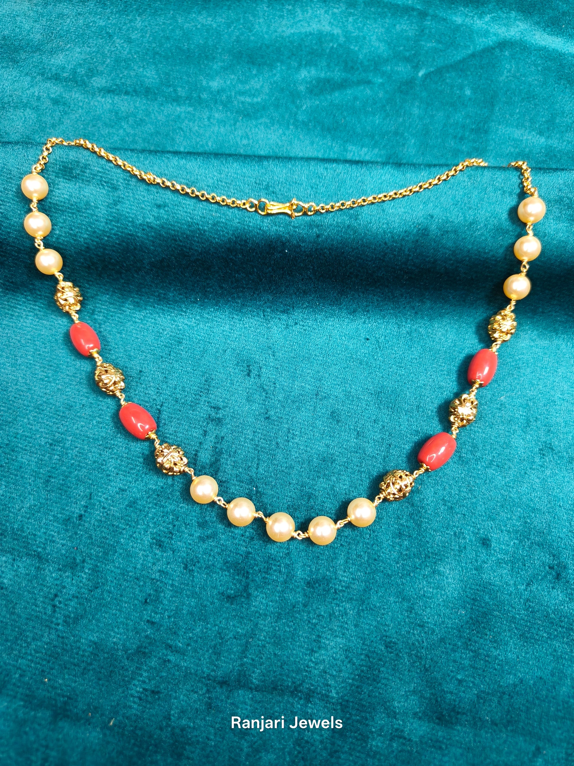 Style this Mallika necklace with cotton sarees, linen outfits, or simple ethnic wear to highlight the handcrafted coral beads and achieve a graceful, minimal look.