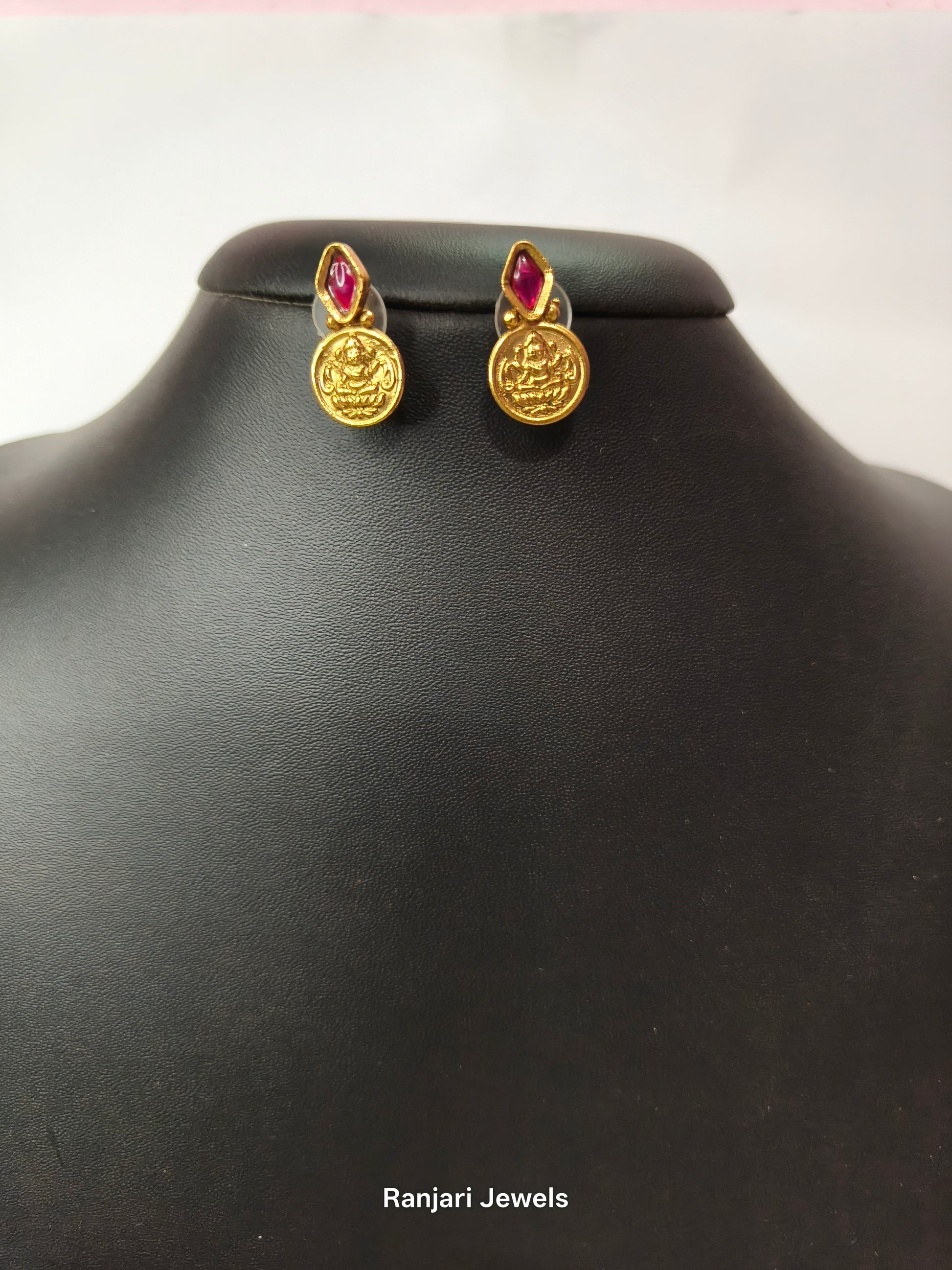 Traditional Lakshmi coin Kasu Mala with ruby-green stones & matching coin Stud– a timeless South Indian design.