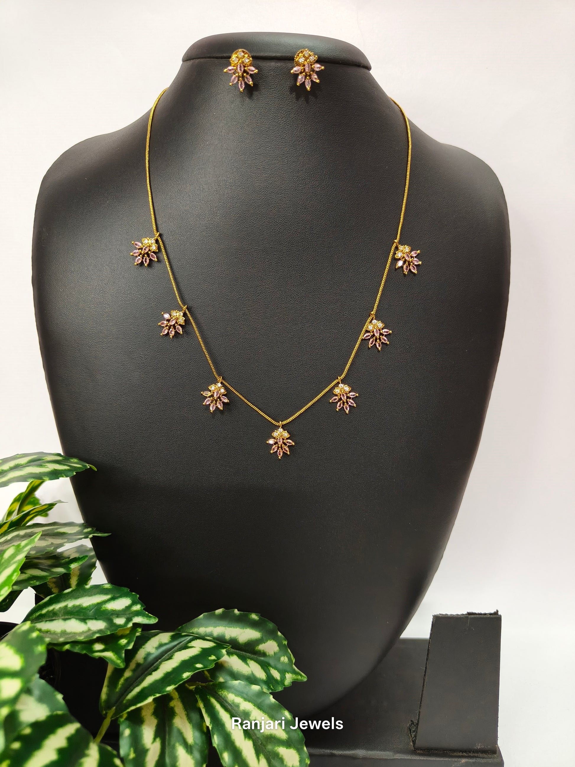 A lightweight floral necklace set featuring delicate pink stone blossoms on a fine gold-finish chain. Paired with matching floral studs, this elegant design is perfect for daily wear, gifting, and minimal festive styling.
