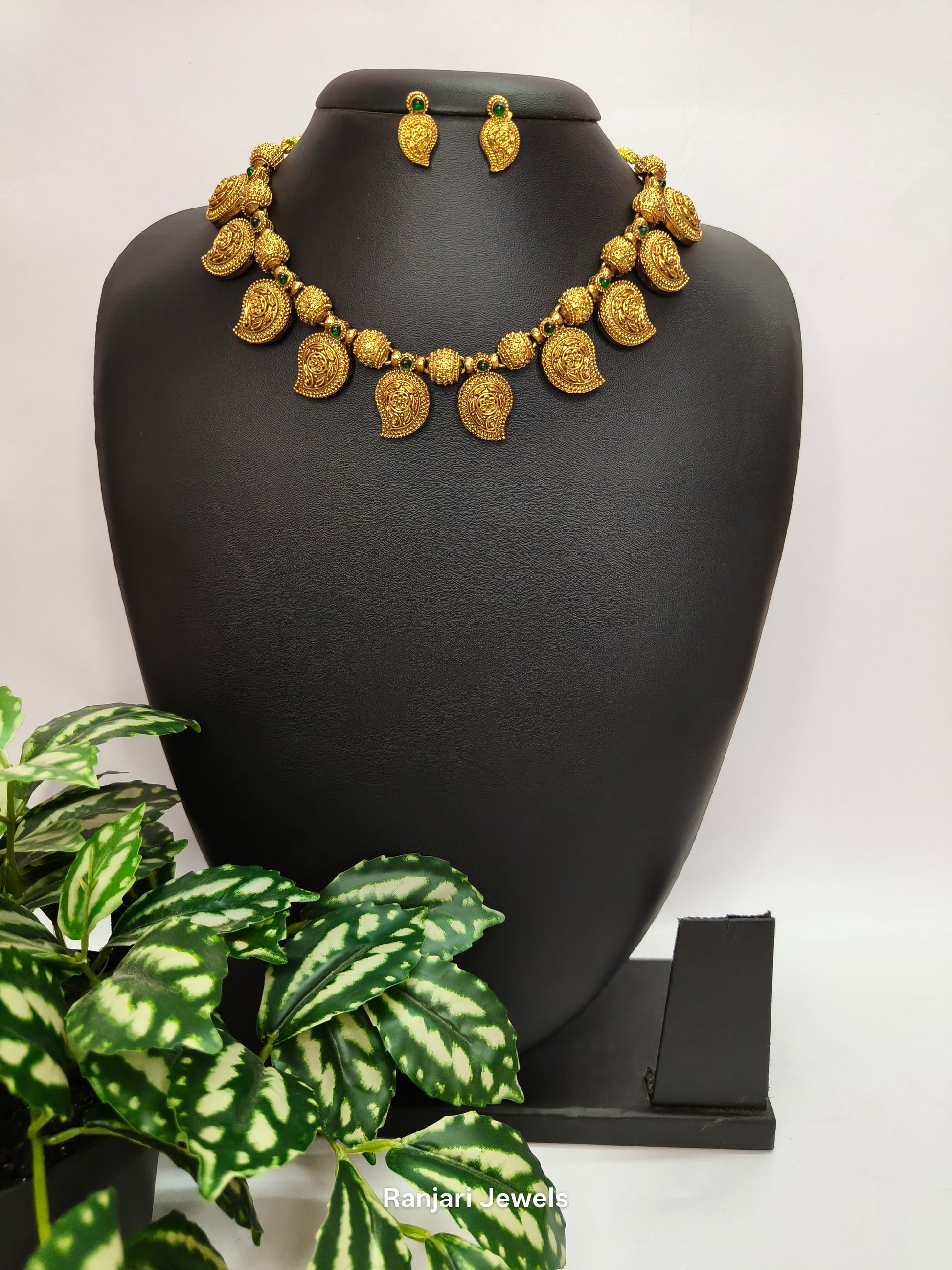 The Real Gold Replica Antique Maanga Necklace Set offers a beautiful, classic look inspired by traditional designs. It mimics genuine gold, adding elegance to any outfit for both casual and festive occasions. With detailed craftsmanship and a timeless maanga motif, this set is comfortable to wear and adds a touch of vintage charm to your jewelry collection.