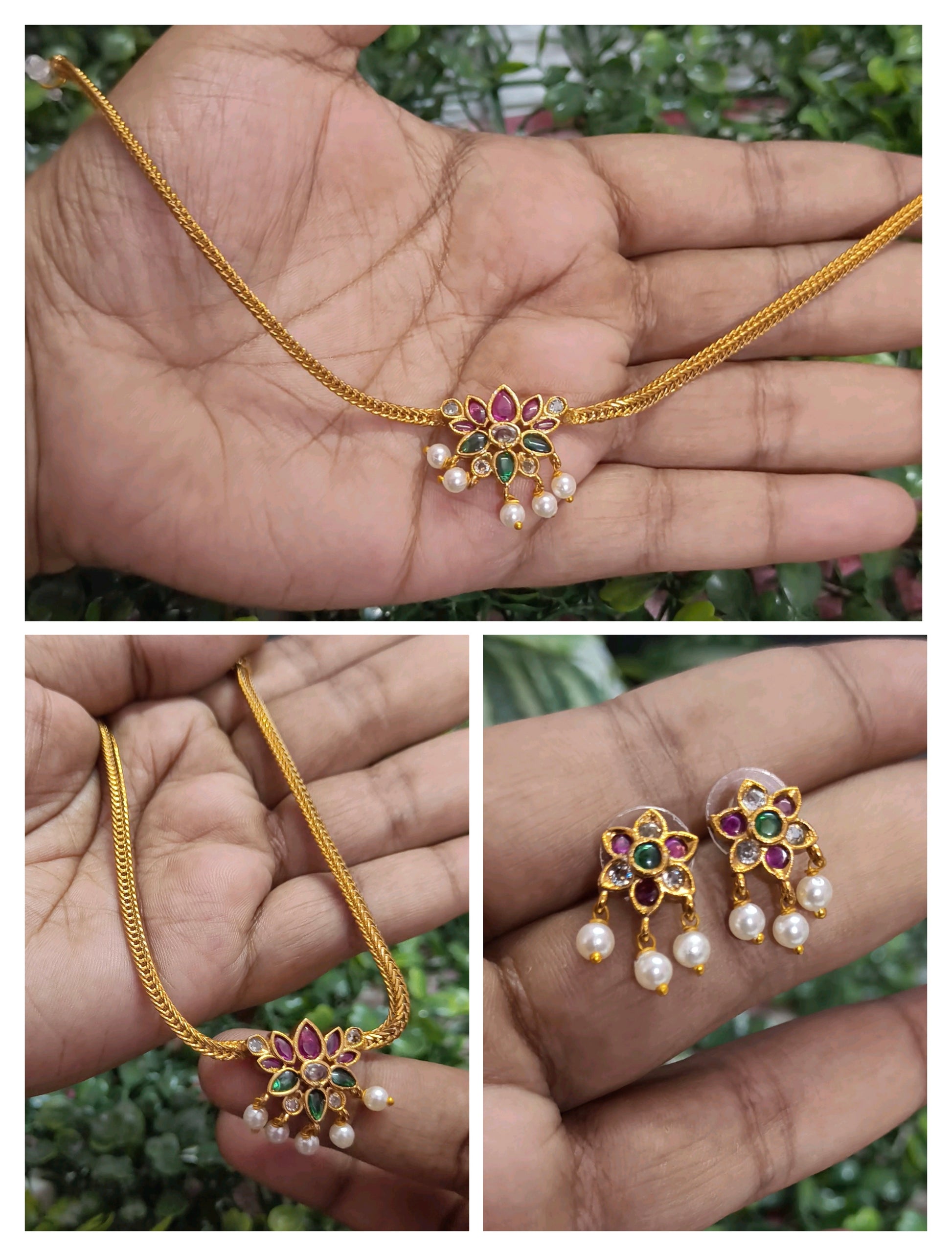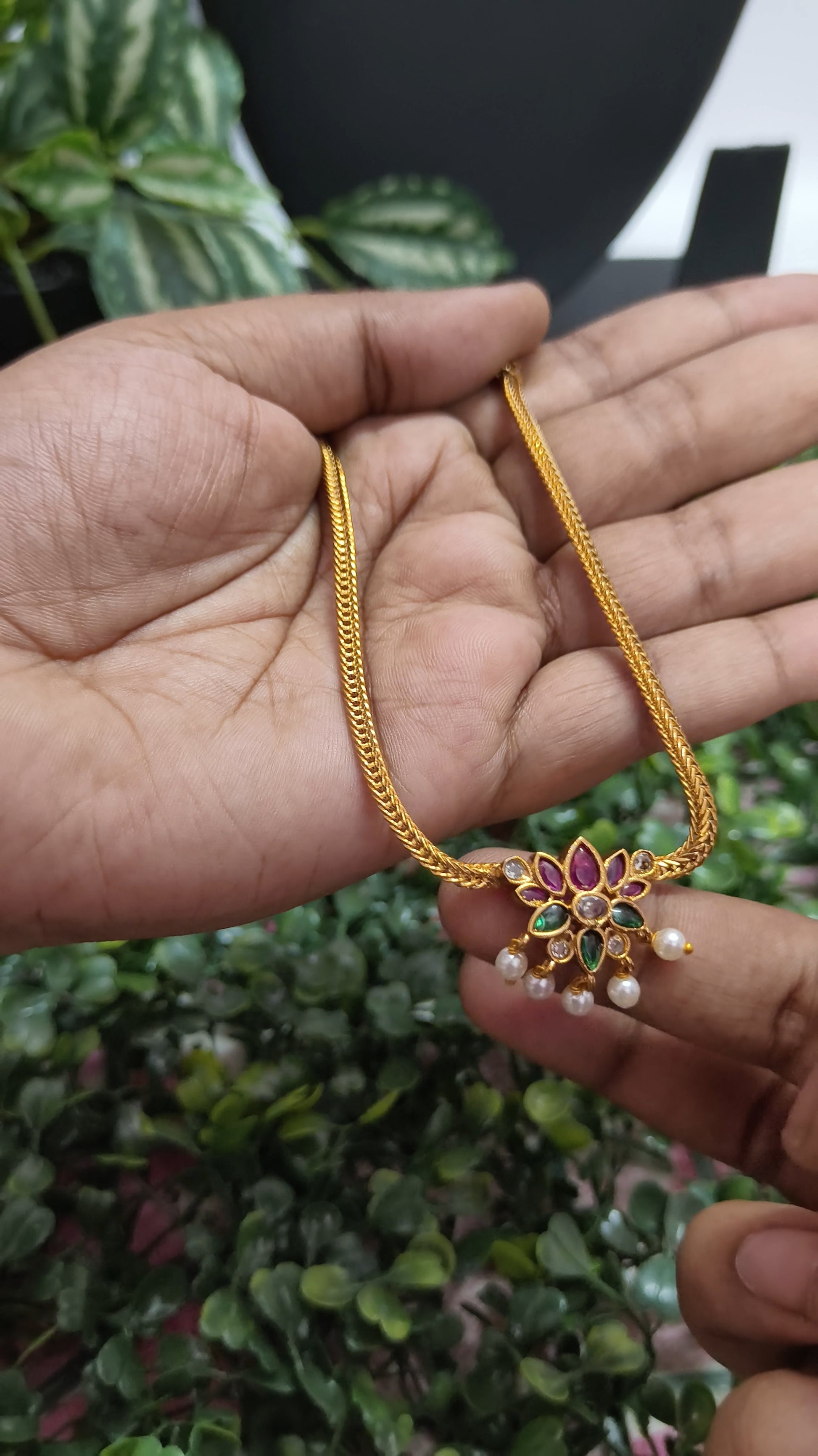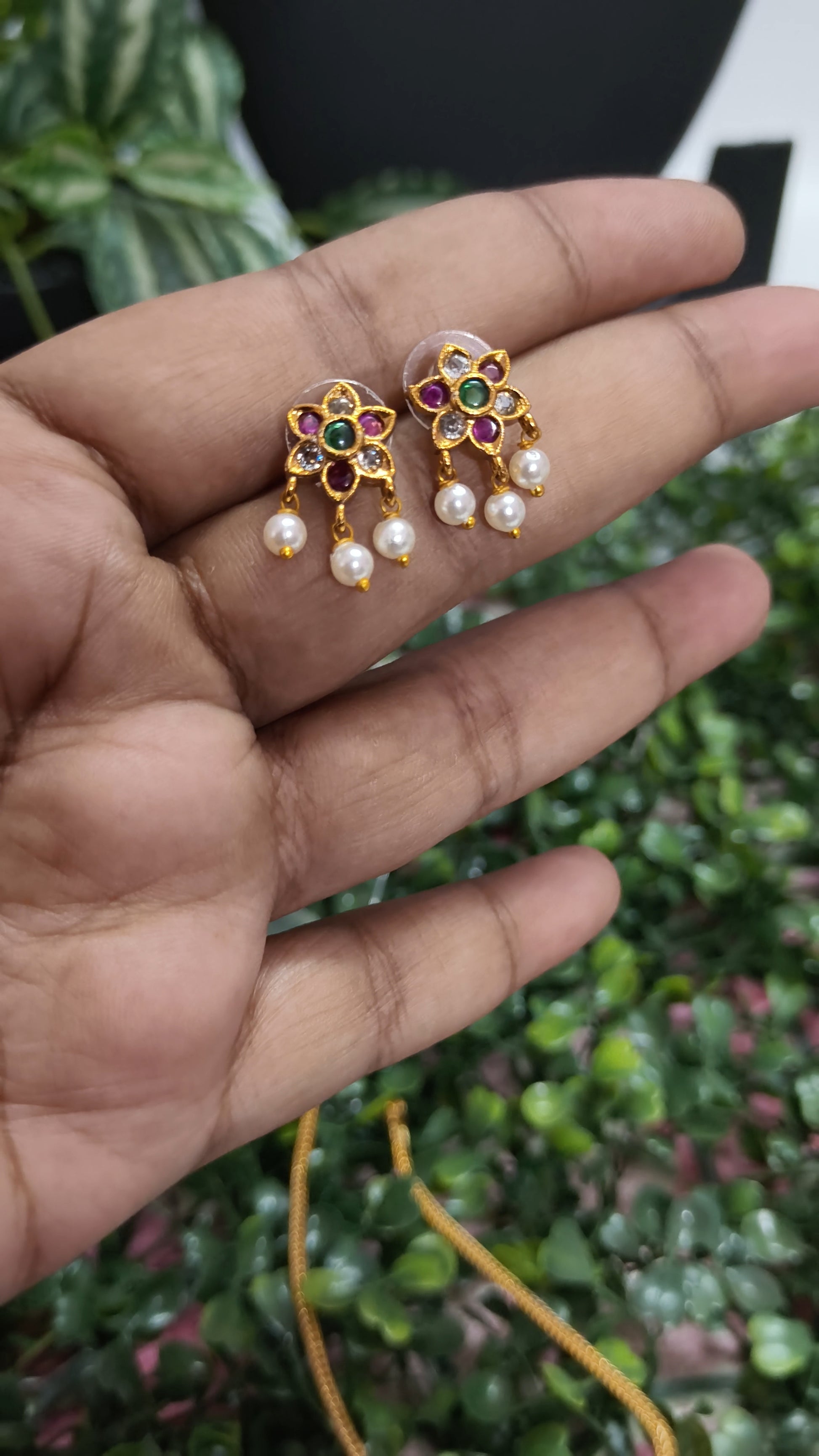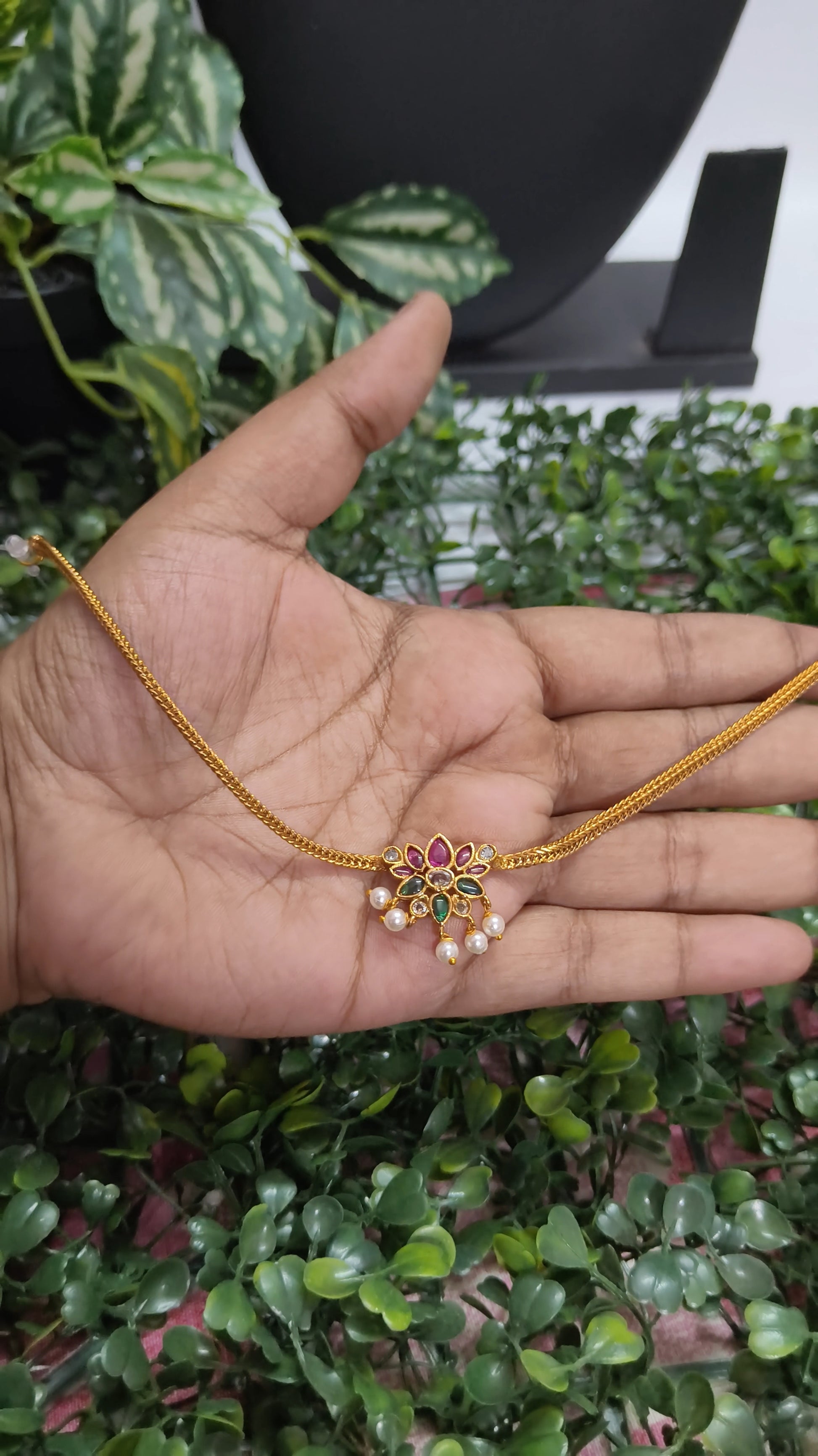 A beautifully crafted floral Attigai featuring rich ruby & emerald–tone stones, finished with delicate pearl droplets. Perfect for sarees, festive functions, temple visits, and everyday traditional styling. Lightweight, skin-friendly, and designed for a premium gold-like finish.