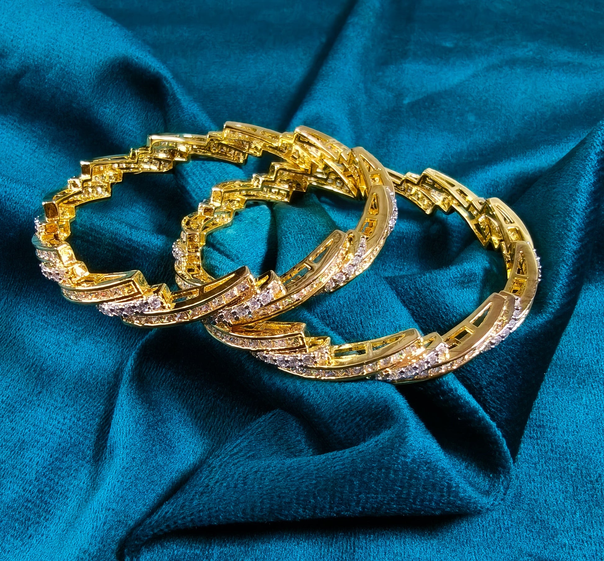 This is premium diamond replica bangle featuring high-shine diamond-cut stones and a rich gold-tone finish. Designed for a luxurious, real-diamond look, it comes with a 1-year stone warranty for complete peace of mind.
