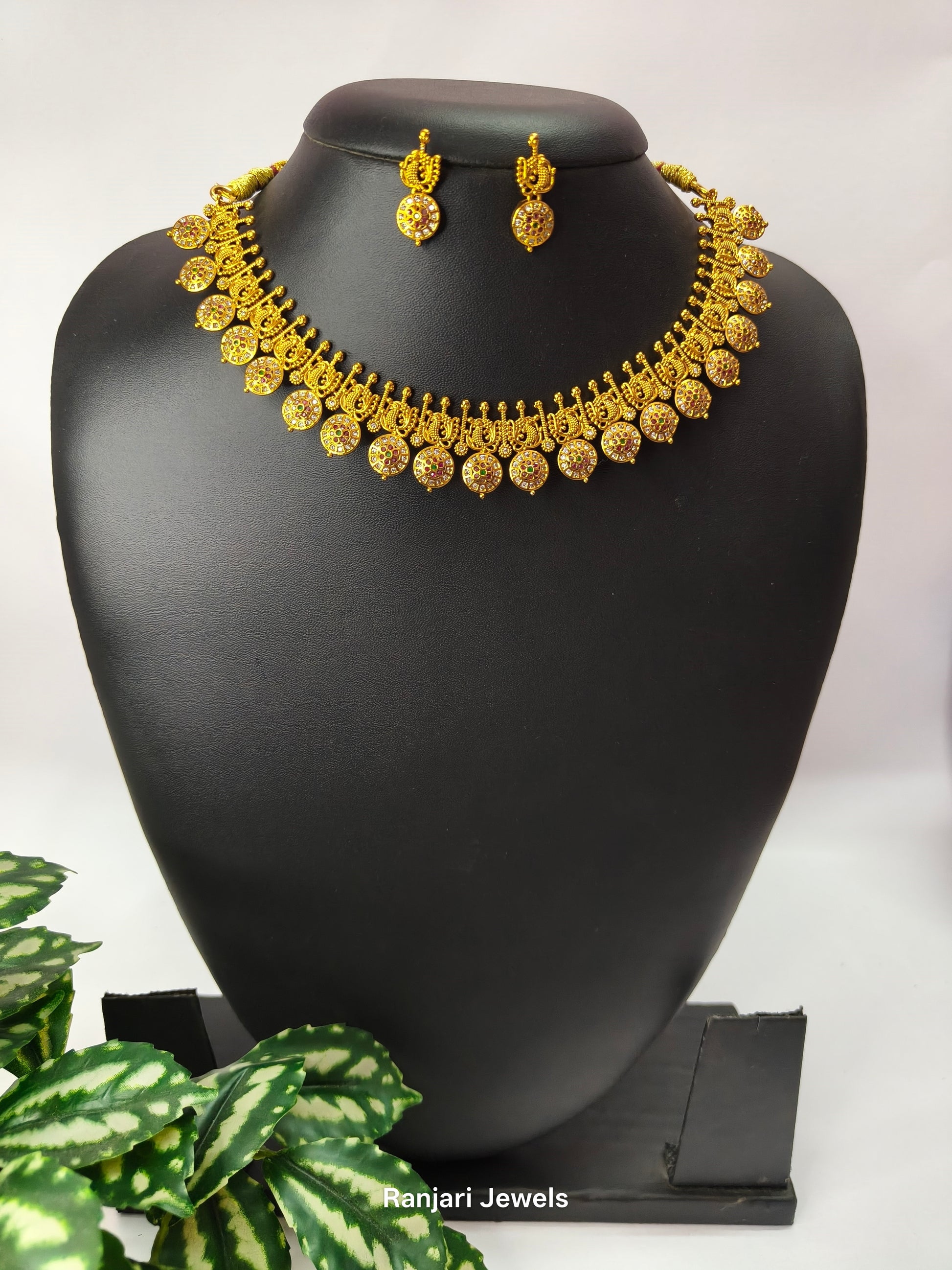 The Vaibhavi Temple Coin Necklace set features classic Lakshmi coin designs with colorful ruby, emerald, and CZ stones. It has an antique gold finish and comes with matching earrings, ideal for weddings and festive events.